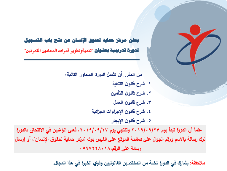 علماً أن الدورة تبدأ يوم 23/09/2019 وتنتهي يوم 27/09/2019، فعلى الراغبين في الالتحاق بالدورة ترك رسالة بالاسم ورقم الجوال على صفحة الموقع على الفيس بوك "مركز حماية لحقوق الإنسان"، أو إرسال رسالة على الرقم:0597228018