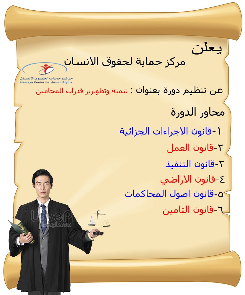 ملاحظة: يشارك في الدورة نخبة من المختصين القانونيين وذوي الخبرة في هذا المجال.