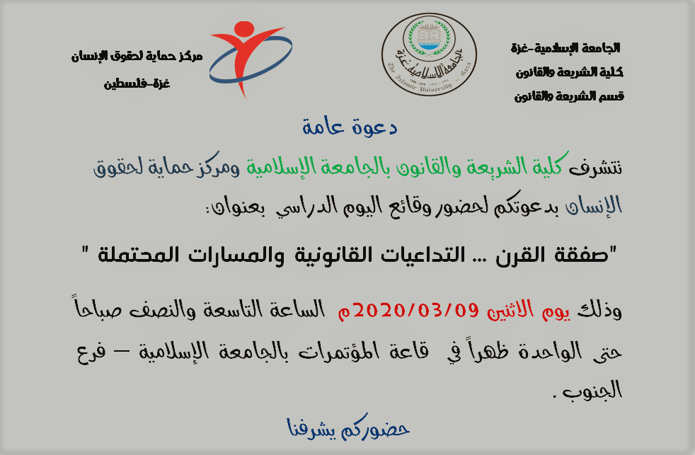 يدعوكم مركز حماية لحقوق الإنسان و قسم الشريعة والقانون في الجامعة الإسلامية بغزة، لحضور وقائع اليوم الدراسي بعنوان: