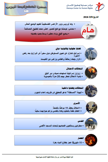 نشرة حقوقية يومية تضم أهم الاخبار: قضايا دولية - انتهاكات داخلية - انتهاكات احتلال - أسرى - استيطان - حصار- القدس - اللاجئين