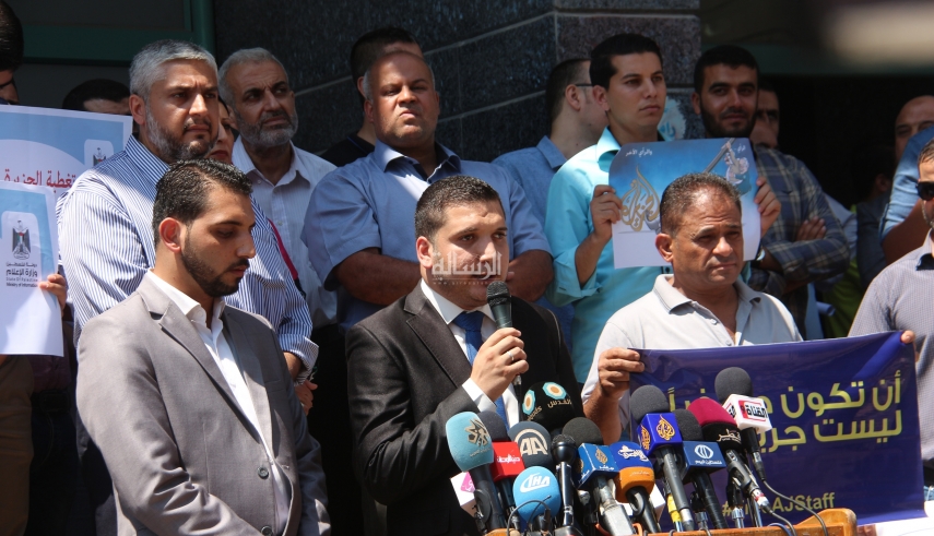 شارك مركز حماية لحقوق الإنسان في الوقفة التضامنية التي دعا إليها المكتب الإعلامي الحكومي، أمام مقر القناة بمدينة غزة، جاء ذلك عقب تصريح وزير الاتصالات الإسرائيلي أيوب القرا والقاضي بإن إسرائيل قررت إلغاء اعتماد الصحافيين في قناة الجزيرة وإغلاق مكتبها في القدس المحتلة وسحب بث محطات الإذاعة القطرية من الأقمار الصناعية، وفي تصريح للمركز أكد وسيم الشنطي المحامي في المركز أنهم ينظرون ببالغ الخطورة لانتهاكات الاحتلال الإسرائيلي لحربة الرأي والتعبير والعمل الصحفي في فلسطين، وطالب بضرورة تعزيز الحريات واحترام الحقوق وأهمها الحق في حرية التعبير عن الرأي ، ونوه أن هذا الحق مكفول بموجب أحكام القانون الدولي ، والتي أهمها المادة "19" من الإعلان العالمي لحقوق الإنسان حيث ذكر في تصريحه أمام جموع المشاركين أن المادة نصت على" أن الحق الأساسي في حرية التعبير يشمل الحق في استقصاء الأفكار والأنباء وتلقيها ونشرها بأي وسيلة كانت"، وأكد وسيم الشنطي محامي المركز على دور قناة الجزيرة في فضح ممارسات الاحتلال والتي تمثل انتهاكات جسيمة ومنظمة لأحكام القانون الدولي والشرعة الدولية، وطالب المجتمع الدولي بالتدخل الفوري لإجبار "إسرائيل" على احترام حرية الرأي والتعبير المكفولة بالاتفاقيات والمواثيق، ووقف سياسة إغلاق المؤسسات الإعلامية، كما دعا إلى محاسبة المسؤولين السياسيين في حكومة الاحتلال على جريمة خطاب الكراهية والتحريض ضد الكوادر الإعلامية.