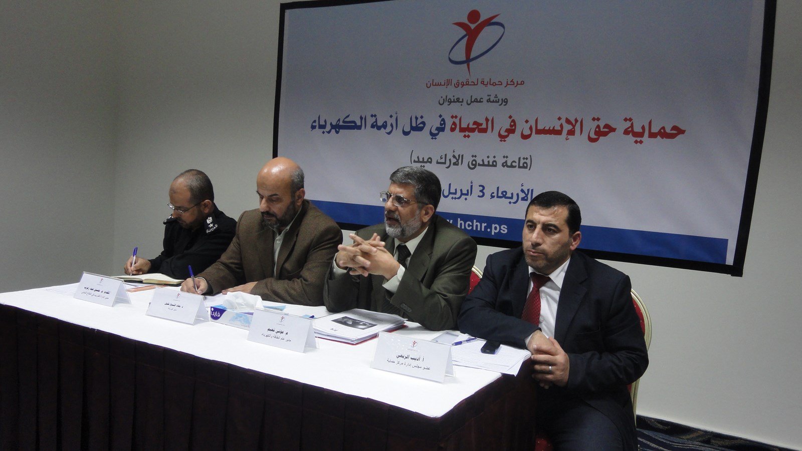 نظم مركز حماية لحقوق الإنسان ورشة عمل بعنوان حماية حق الإنسان في الحياة في ظل أزمة الكهرباء اليوم الأربعاء الموافق 3/4/2013م في فندق الآرك ميد بحضور كل من د. نهاد الشيخ خليل مدير الورشة و أ. أديب الربعي عضو مجلس إدارة مركز حماية لحقوق الإنسان وم. عوني نعيم مدير عام الطاقة والكهرباء، والمقدم م. حسين عيد زعرب مدير إدارة التدريب في الدفاع المدني .