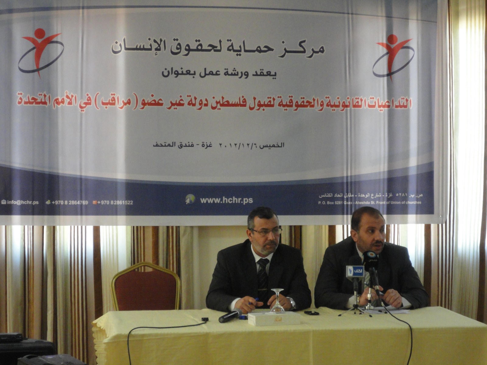 نظم مركز حماية لحقوق الانسان اليوم الخميس 6/12/2012 ورشة عمل بعنوان "التداعيات القانونية والحقوقية لقبول فلسطين دولة غير عضو (مراقب) في الامم المتحدة" في فندق المتحف في مدينة غزة وذلك انطلاقا من حرص المركز على مناقشة واثراء هذا الحدث السياسي الكبير من وجهة النظر الحقوقية.