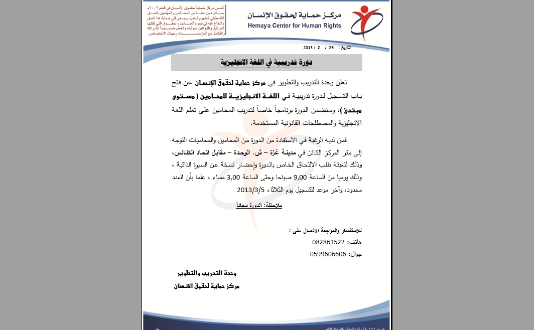 تعلن وحدة التدريب والتطوير في مركز حماية لحقوق الإنسان عن فتح باب التسجيل لدورة تدريبية في اللغة الانجليزية للمحامين ( مستوى مبتدئ )، وستضمن الدورة برنامجاً خاصاً لتدريب المحامين على تعلم اللغة الانجليزية والمصطلحات القانونية المستخدمة.