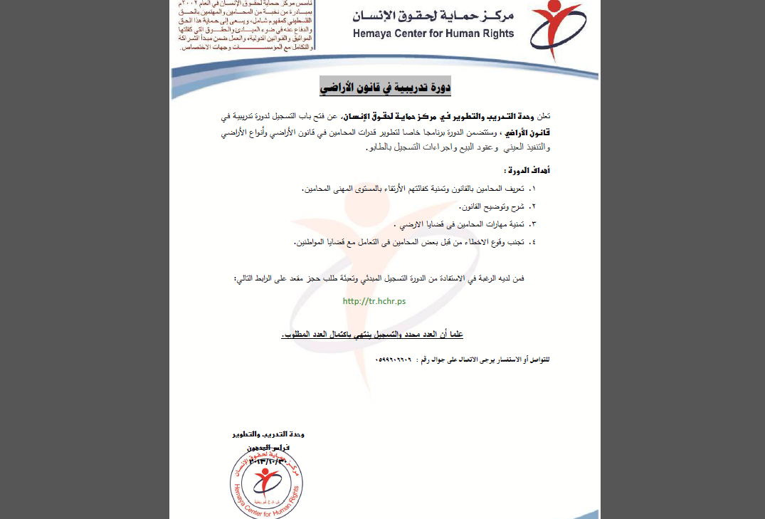 تعلن وحدة التدريب والتطوير في مركز حماية لحقوق الإنسان، عن فتح باب التسجيل لدورة تدريبية في قانون الأراضي ، وستتضمن الدورة برنامجا خاصا لتطوير قدرات المحامين في قانون الأراضي وأنواع الأراضي والتنفيذ العيني وعقود البيع واجراءات التسجيل بالطابو.